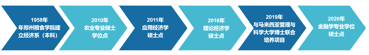 与本学位授权点相关的本科层级教育始于1958年郑州粮食学院建立的经济系,产业经济学硕士研究生(二级学位授权点)于2004年开始招生,2013年开始以应用经济学硕士一级学位授权点招生,2018年理论经济学硕士一级学位授权点开始招生;农业硕士(农业管理领域)2011年开始招生,金融硕士学位授权点2020年获批。