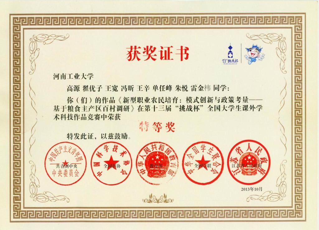 (“挑战杯”全国大学生课外学术科技作品竞赛特等奖证书)