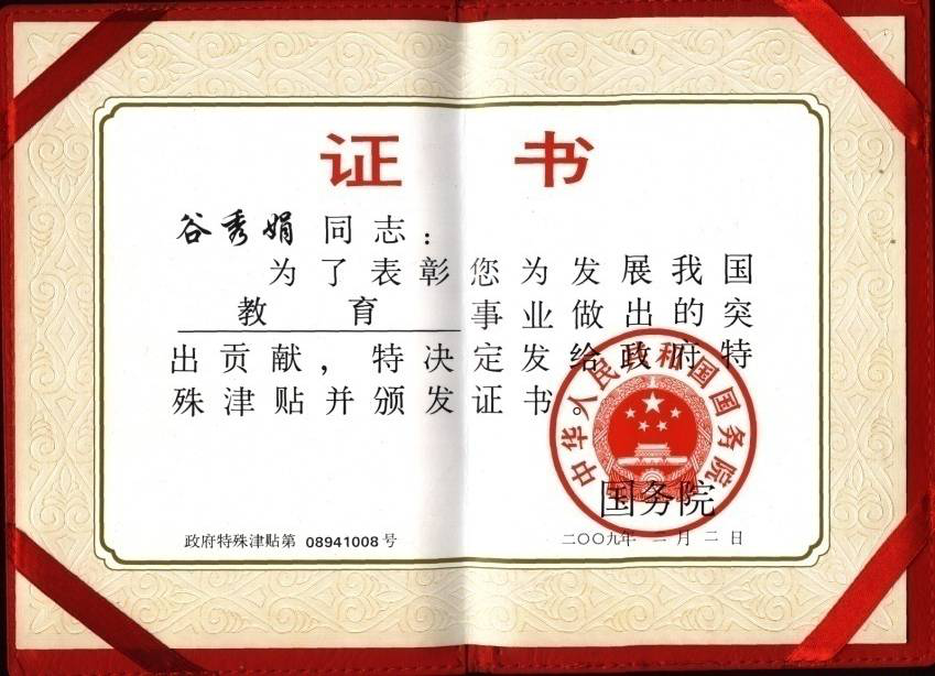 (谷秀娟教授的享受国务院特殊津贴专家证书)