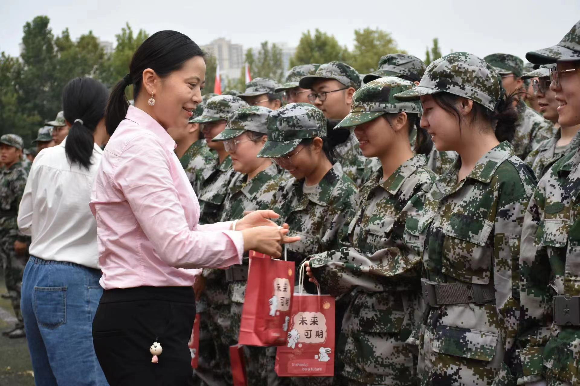 岳鹏珍及辅导员们现场观看了22级学生的训练情况,同学们整齐的步伐、高昂的训练热情充分展现了经贸学子的精神面貌。随后,岳鹏珍代表学院对辛苦训练的2022级学生表达了最诚挚的问候和鼓励,她表示,军训是一堂生动的爱国主义教育课,对于青年学子磨砺心智、增强体质具有重要意义;希望大家珍惜训练机会,在军训中砥砺品格,把吃苦耐劳的品质、雷厉风行的作风、一切行动听指挥的光荣传统带到今后的学习生活中去。最后,学院领导老师为每位参训学子送上学院精心准备的慰问品,并预祝全体22级学生在军训中都能有所收获。