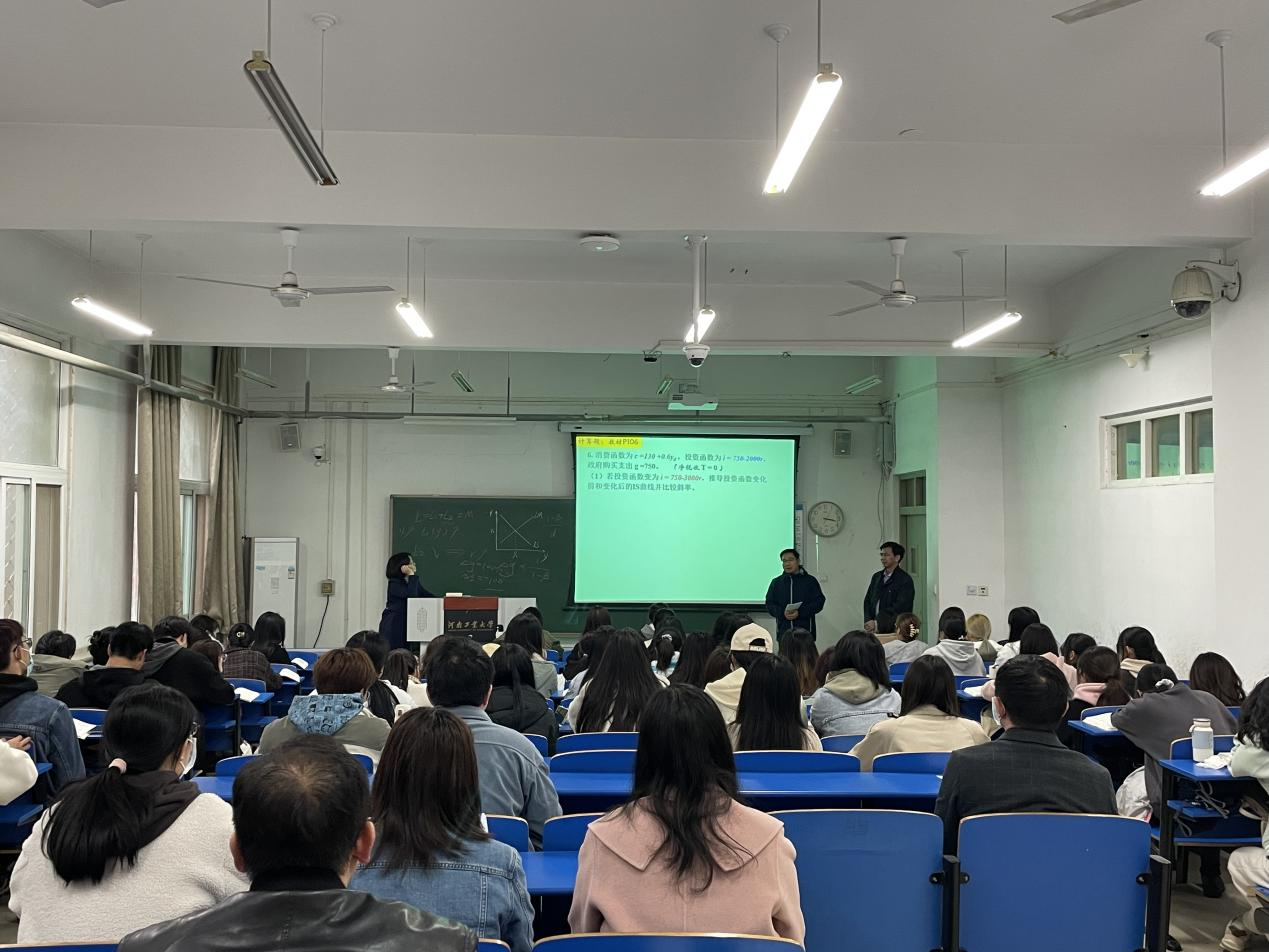 经济学系王松梅为河南省一流本科课程负责人、河南省教学标兵,本学期主讲《宏观经济学》。上课开始,她首先带领学生回顾前期所学知识点,用学生熟悉的知识点引出本节课所要讲的内容,即《宏观经济学》第六章第二节财政政策,主要讲述了财政政策的效应和局限性。随后,她对不同学派对财政政策“挤出效应”的不同观点进行讲解,为学生进行理论的拓展,与学生进行互动,让学生深度参与课堂。