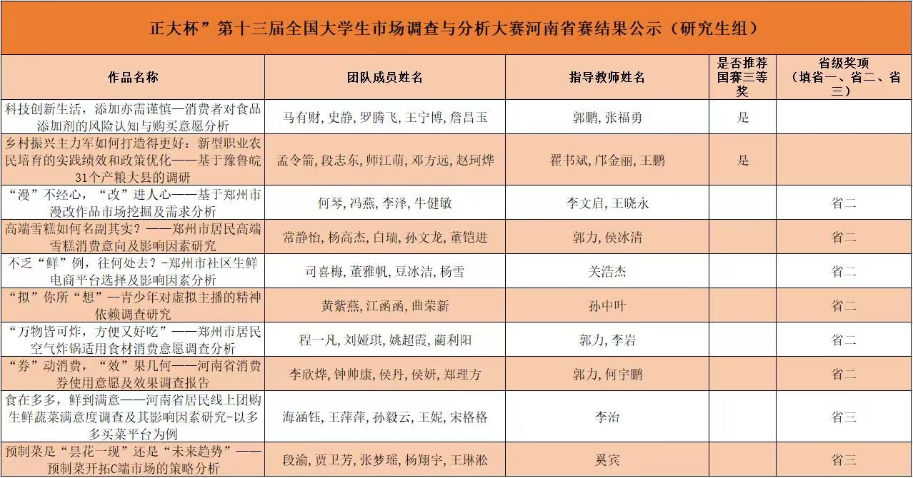 共有10支队伍参赛,经过老师和同学们的不懈努力,获得了丰硕的成果,全省74支队伍中我校参赛团队分别获得国赛三等奖两项、省赛二等奖六项、省赛三等奖三项。其中,由郭鹏和张福勇老师共同指导的作品《科技创新生活,添加亦需谨慎—消费者对食品添加剂的风险认知与购买意愿分析》以及翟书斌、邝金丽、王鹏三位老师共同指导的作品《乡村振兴主力军如何打造得更好:新型职业农民培育的实践绩效和政策优化——基于豫鲁皖31个产粮大县的调研》荣获国家三等奖。