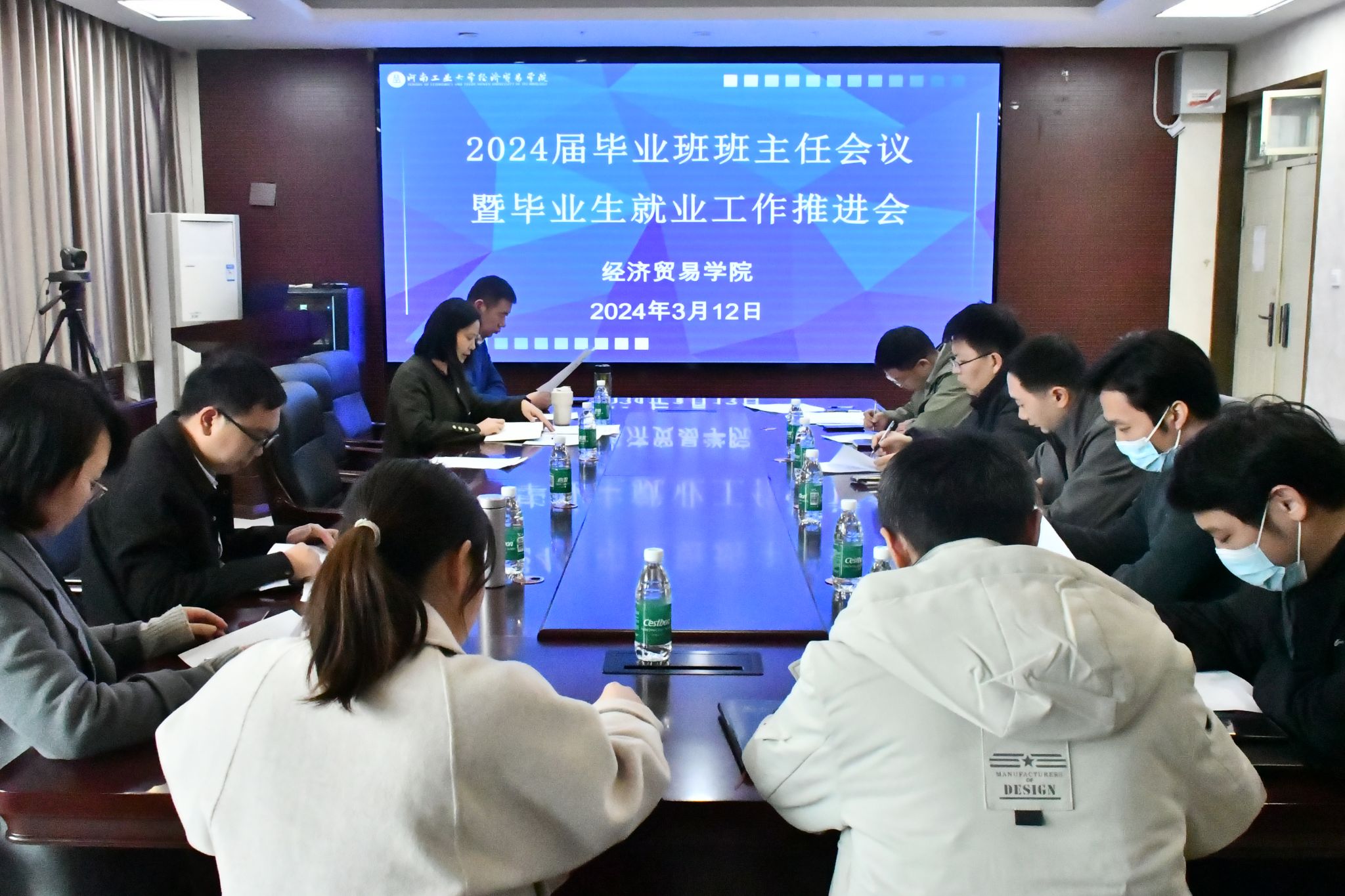 在博识楼3501会议室召开2024届毕业班班主任就业工作推进会。学院党委书记李刚、党委副书记岳鹏珍、学工办主任张福勇、辅导员张瑞玲和全体毕业班班主任参加会议,会议由岳鹏珍主持。