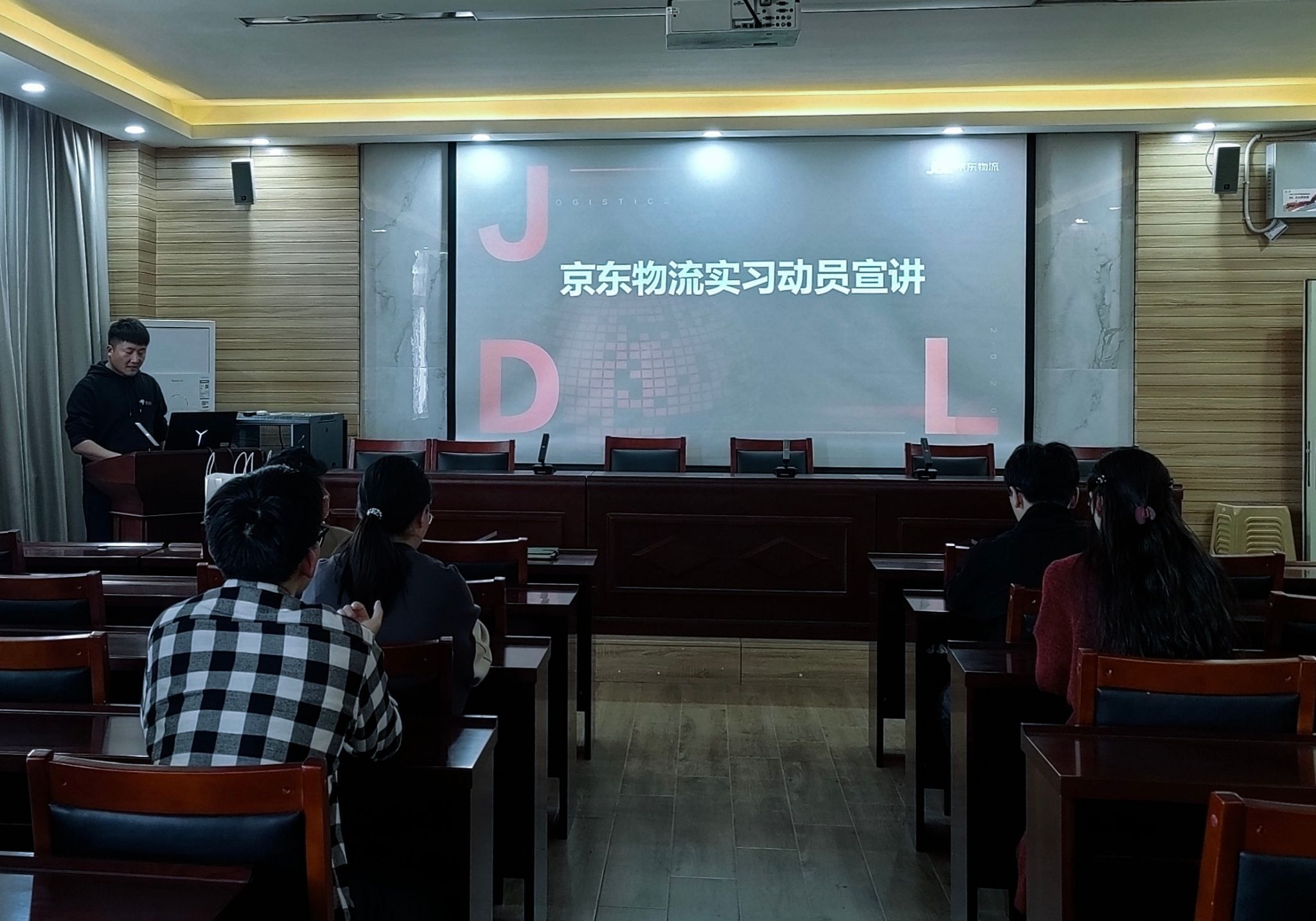 学生在京东物流集团实习与就业的预期情况,并对同学们关心的福利待遇、企业关怀政策等做了细致介绍。互动环节中,学生们积极提问,对实习岗位的具体内容、以及未来的职业发展路径等问题表现出浓厚兴趣。最后,邵经理真诚邀请同学们加入京东物流实现自己的梦想,用知识回馈社会,用汗水成就未来。