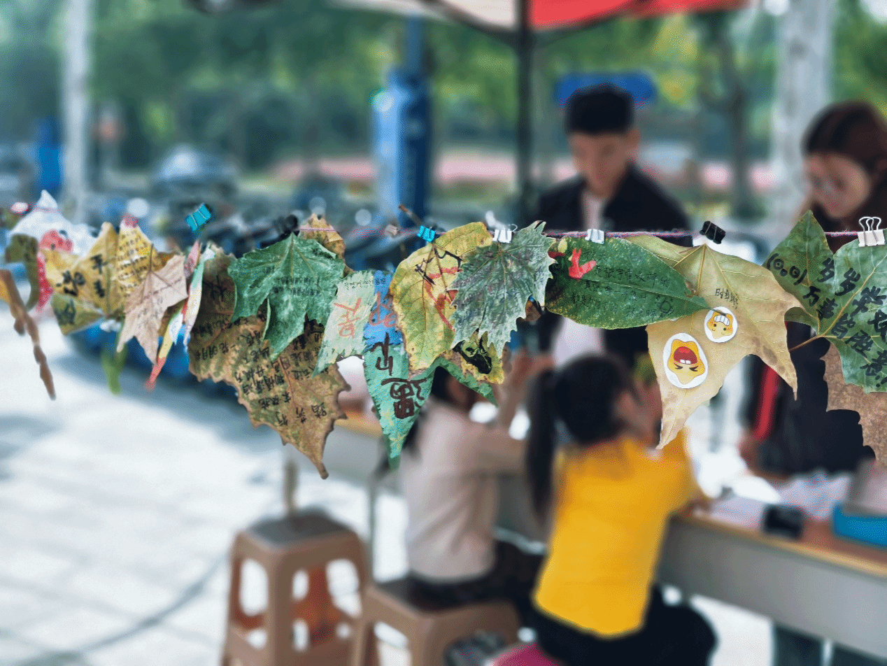 此次活动同学们需要对捡到的枫叶进行艺术创作,可以写一句话、一句诗、做成手工艺品等,在提升心理健康水平的同时,激发了同学们的创作灵感。