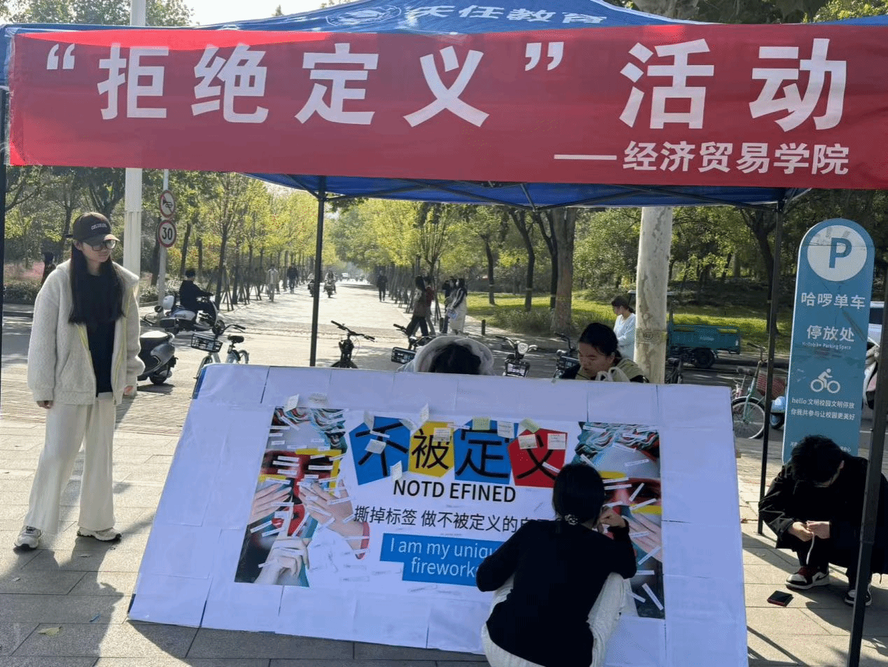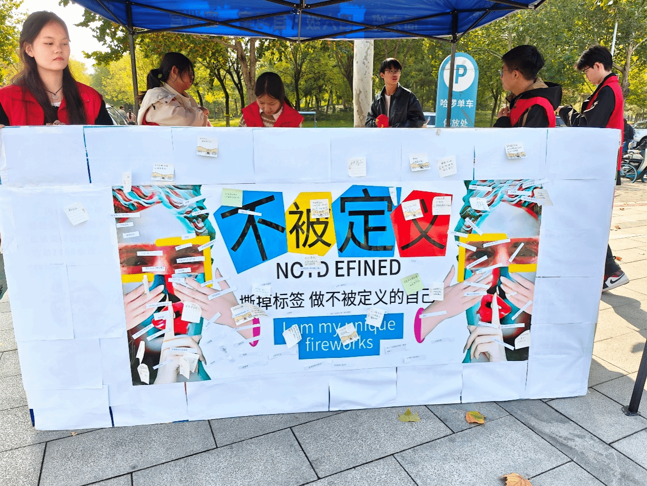 活动现场气氛热烈,吸引了众多同学参与。通过设置专门的展板,上面贴满了各种带有负面定义和标签的纸条,如“胆小鬼”“失败者”等,同学们积极上前撕下这些标签,表达对被不合理定义的反抗,并写上自己想说的话。这一过程不仅让参与者有了情感的宣泄,更重要的是传递了拒绝被他人简单定义的理念,鼓励大家勇敢地拒绝被定义,追求真实、多元的自我。