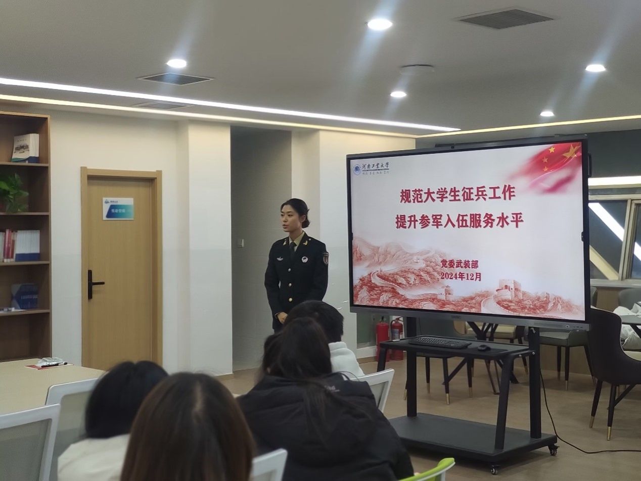首先,退伍学生王越胜、张该条和杨博结合自己的军旅生活,分享了参军入伍对个人成长、家庭荣誉、社会贡献等方面的积极影响,让同学们深刻感受到了参军入伍的崇高使命和光荣责任,并表示部队是青年学生成长成才的大学校,是砥砺品格、增强意志的好课堂,是施展才华、成就事业的大舞台。退伍学生于欣路解读兵役义务与大学生应征入伍政策,重点介绍了高校大学生应征入伍特有的优先考学提拔、补偿学费、退役后享受就学就业优惠等优抚政策,就同学们关心的事项进行了解答。