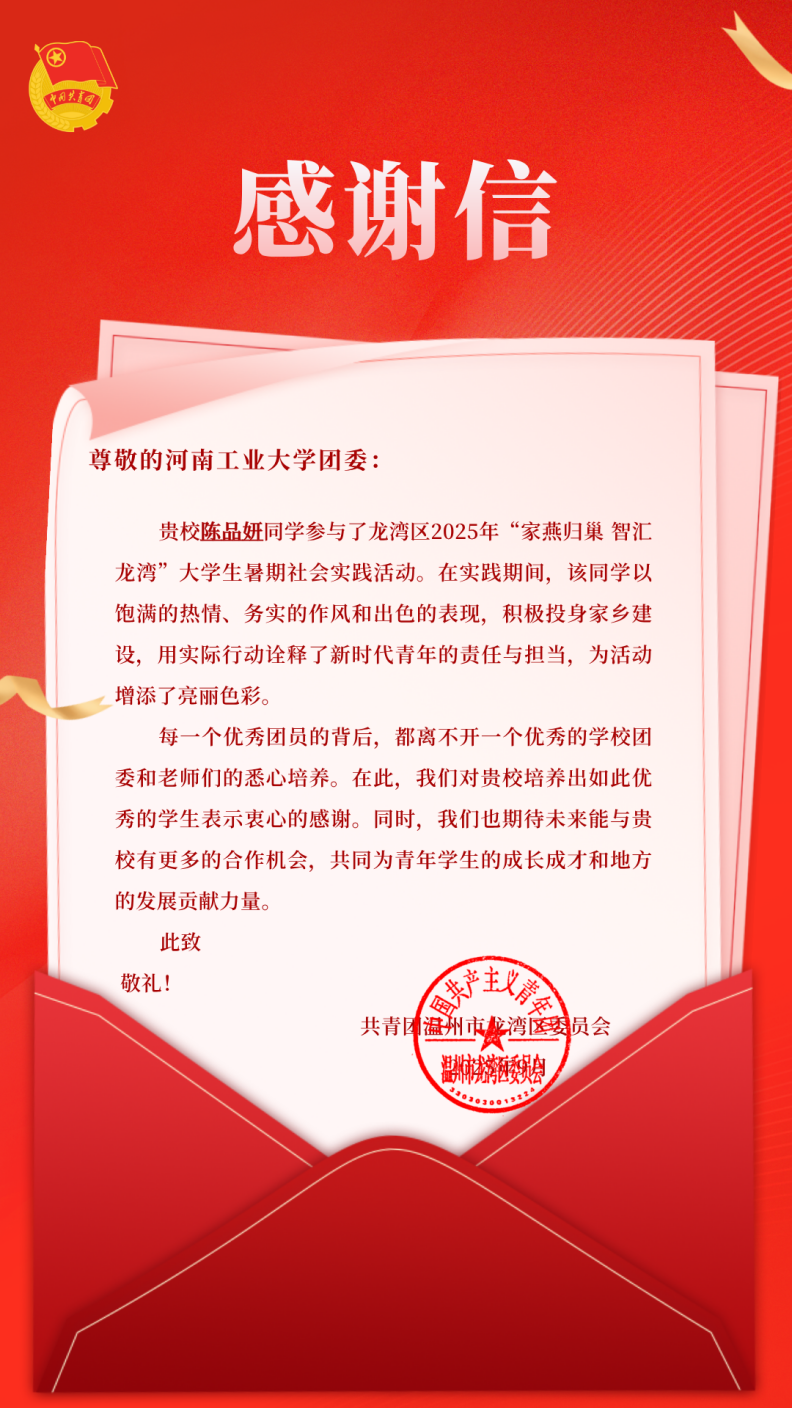 收到一封来自共青团温州市龙湾区委员会的感谢信,信中对2023级经济学专业陈品妍同学在大学生暑期返家乡社会实践活动中的突出表现给予了充分肯定。该同学以饱满的热情投身于服务家乡的务实行动,正是爱影视