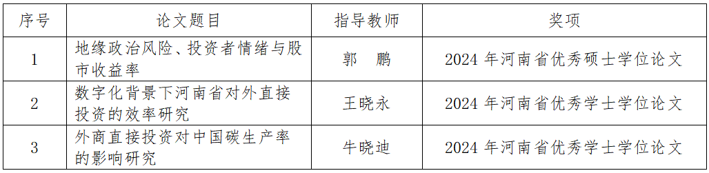 郭鹏老师指导的硕士学位论文《地缘政治风险、投资者情绪与股市收益率》荣获“河南省优秀硕士学位论文”;王晓永老师指导的学士学位论文《数字化背景下河南省对外直接投资的效率研究》和牛晓迪老师指导的学士学位论文《外商直接投资对中国碳生产率的影响研究》荣获“河南省优秀学士学位论文”。爱影视
