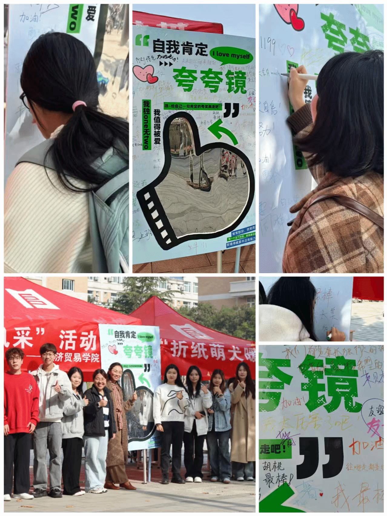举办了以“镜中闪耀,夸出风采”为主题的夸夸镜活动。活动吸引了众多同学参与,同学们在专门设计的展板上写下对自己的鼓励、对同学的赞美,分享身边的温暖小事,不少同学在阅读他人留言时露出笑容,现场氛围温暖而热烈。