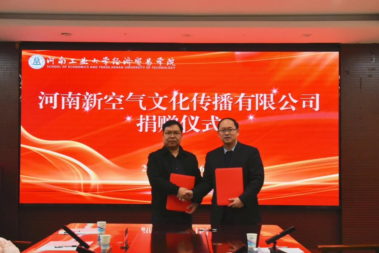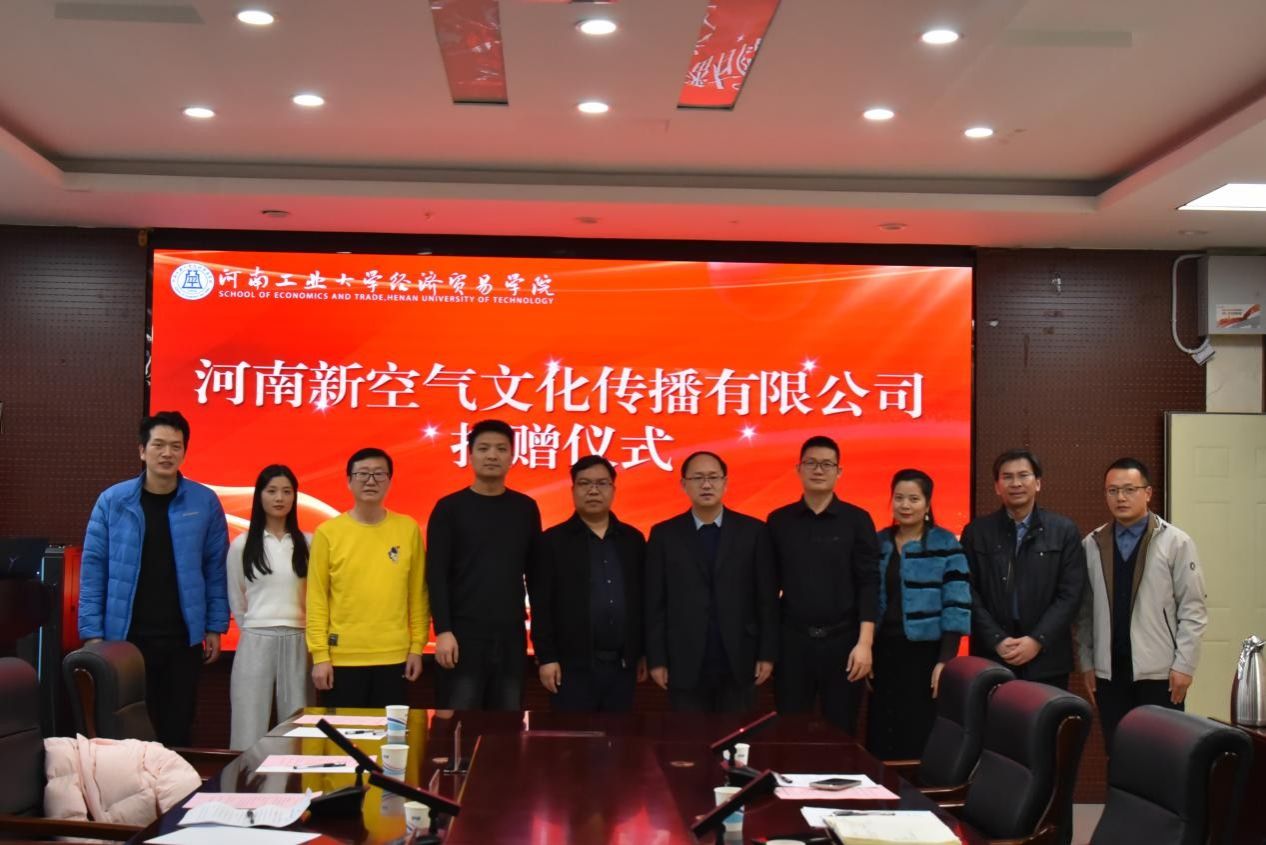 与河南新空气文化传播有限公司于博识楼3501会议室举行捐赠仪式。河南新空气文化传播有限公司董事长李建科、策划总监张胜威、行政总监刘多多,爱影视