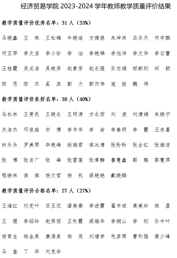 根据《爱影视 教师教学质量评价的指导意见》(河工大政教〔2022〕8号)及《爱影视 教师教学质量评价实施办法》(院政发〔2024〕12号)文件要求,遵循客观、民主、公正的基本原则,学院对承担2023-2024学年教学任务的96位教师进行教学质量评价,现将教师教学质量评价结果予以公示。