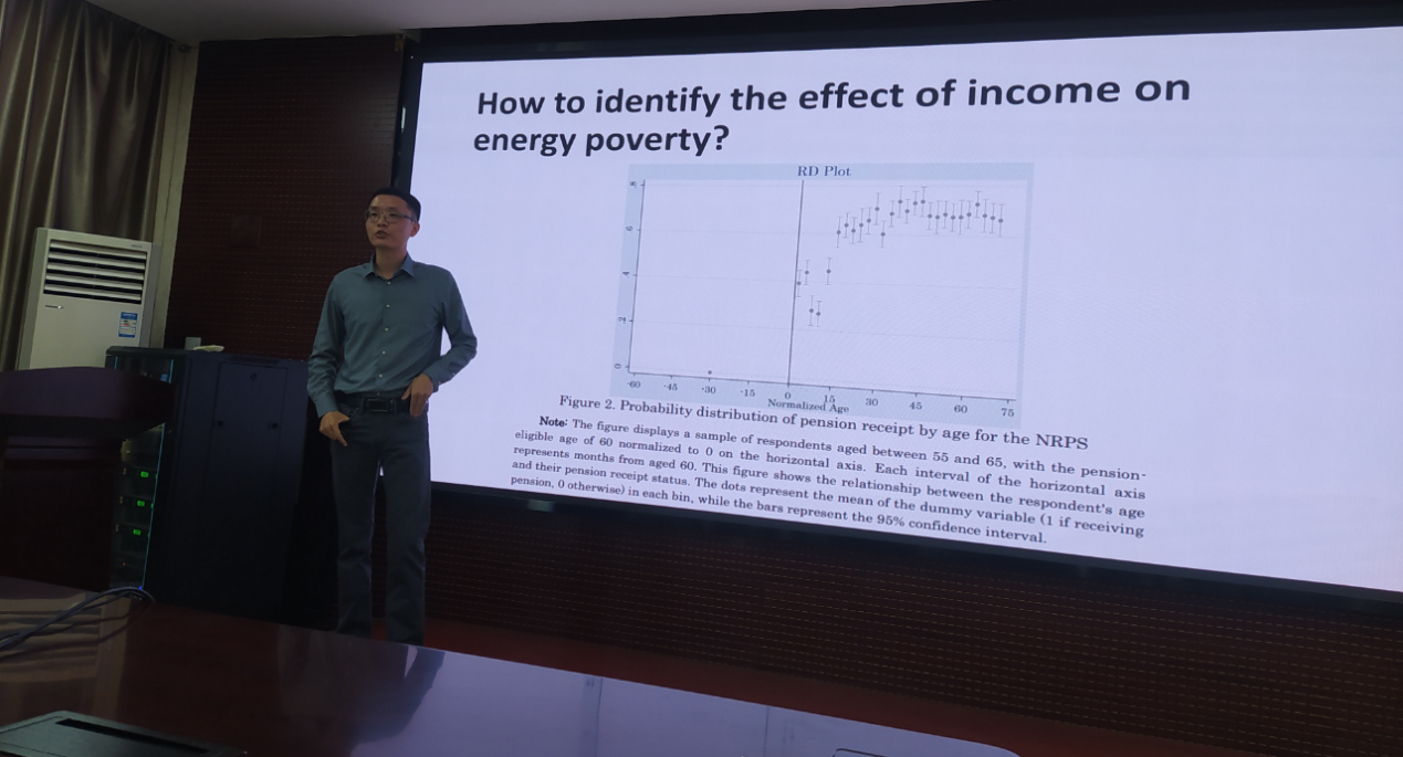 李江龙教授分享了题为“Reducing energy poverty by nearly universal pension coverage of rural China”的工作论文,探讨了新型农村社会养老保险(NRPS)政策对农村家庭能源消费的影响。李教授首先从农村地区能源贫困的诱发原因、政策背景和现实状况等方面阐述了论文的选题依据,其次从能源贫困发生原因及造成影响、新农保覆盖对农村居民用能行为影响和农村家庭能源消费行为三方面进行文献述评,再者利用均衡模型揭示农村居民收入变动对传统能源和现代能源消费的影响,进一步介绍了论文的变量指标、实证结果、稳健性检验和机制分析内容,最后总结研究结论和政策启示。在互动交流环节,学院师生围绕工作论文的研究主题挖掘、数据指标衡量、研究方法甄选等问题与李教授展开交流,李教授基于自身构建的文献库和研究经验进行详细解答。
