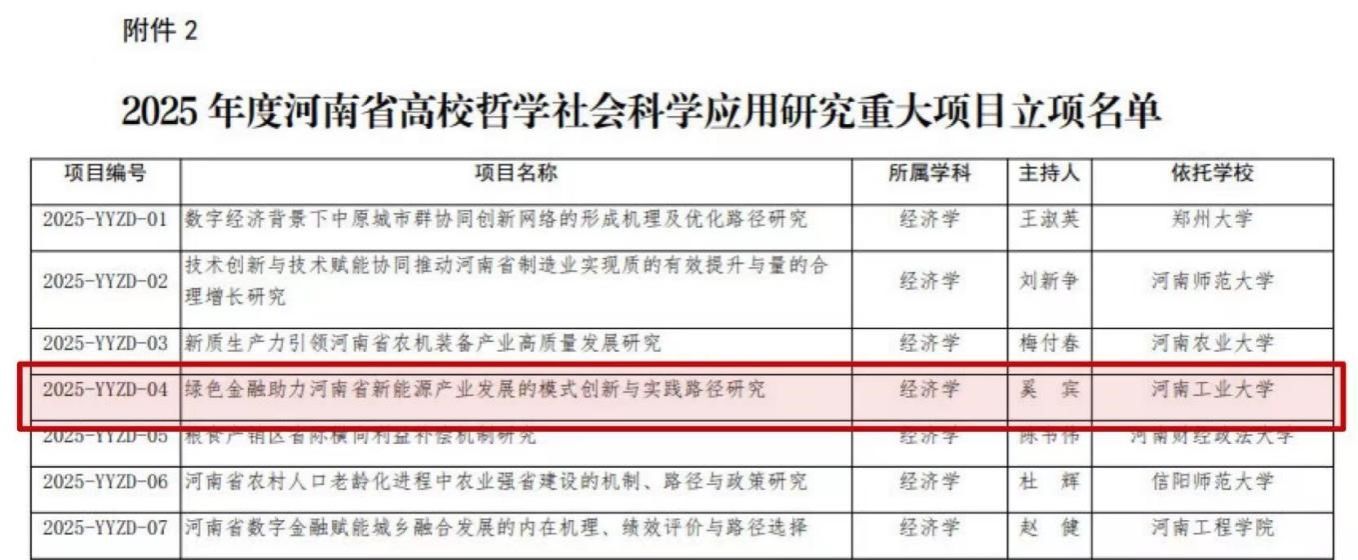 奚宾教授申报的《绿色金融助力河南省新能源产业发展的模式创新与实践路径研究》成功获批立项。