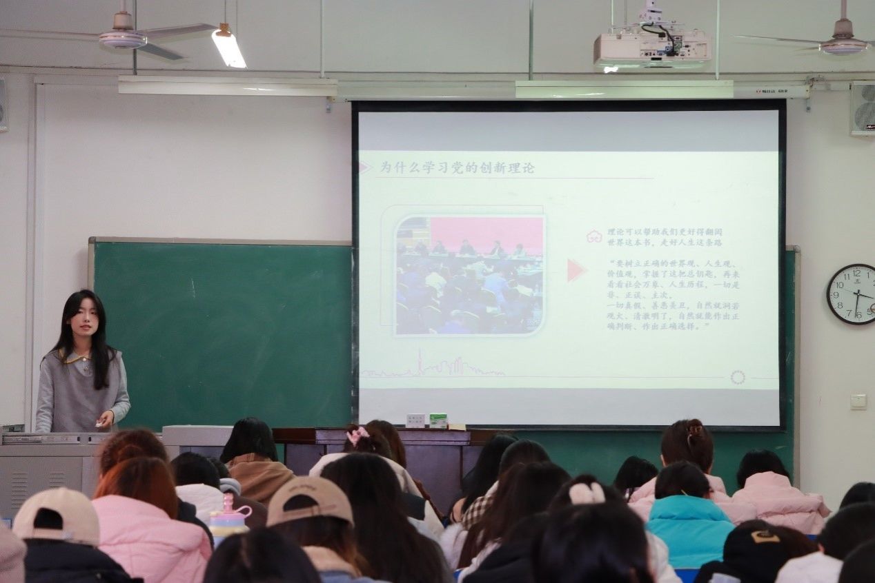 校“大学生理论宣讲团”成员缪梦蕾同学通过“是什么”、“为什么”、“如何做”三方面,生动阐述了党的创新理论。她提到,要围绕党的二十届三中全会精神,深入学习领会全会精神,准确把握新时代改革开放的战略部署。同时她鼓励大家要坚定理想信念,积极为实现社会主义现代化强国的第二个百年奋斗目标贡献青春力量。