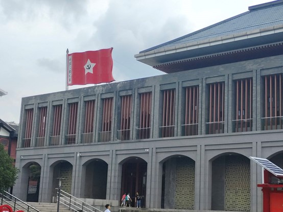 在会馆参观学习期间,团队成员从场馆门口的石碑到会馆楼下,管楼上飘扬着鲜红的中华苏维埃共和国临时中央政府的工农红军旗帜,它不仅是中国共产党枪杆子里出政权的具体体现,还代表着遵义会议后红军不怕远征难,万里千山只等闲的坚定信念。