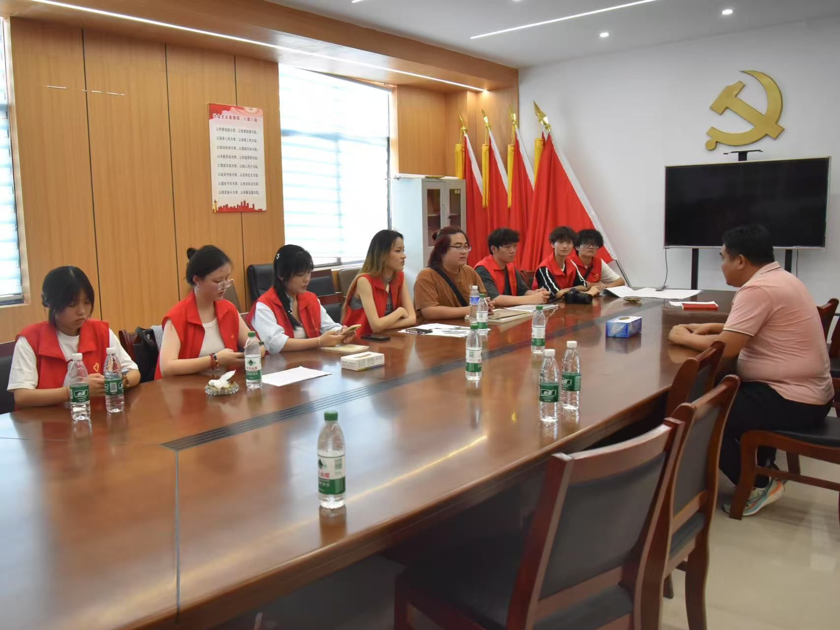 随后实践团成员在村委会与村干部进行了沟通交流。团队成员围绕乡村治理与产业发展等问题与村干部展开对话。谈及村内事务管理,村干部介绍,班村通过成立红白理事会规范民俗事务,不仅制定了统一的办事标准,还组织村内有烹饪技能的村民组成专职厨师团队,集中办理红白喜事,这种做法既保留了情谊传承的温度,又树立了文明节俭新风。交流延伸至村庄治理细节,谈及养老这一民生关切,村干部介绍了正在筹建的老年食堂,旨在为村里孤寡老人提供就餐保障,解决外出务工青年的后顾之忧。此外,班村在村务管理方面实行公开透明、公正公平的原则,“采购清单提前一周公示,大家讨论决策,每周的财政支出公示表都会贴在村委会公告栏上,大到产业项目投资,小到办公用品采购,每一笔款项都标注得十分详细。”村干部在交流中介绍到。