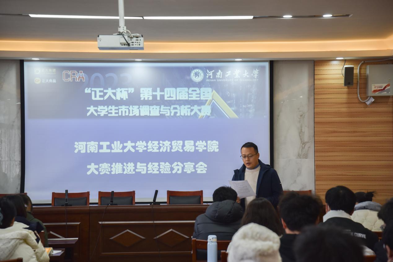 会议伊始,何宇鹏老师向大家介绍了学院里具备市场调研大赛丰富指导经验的老师们,并鼓励同学们会后积极咨询相关老师,与老师沟通组队、选题及项目论证等工作。