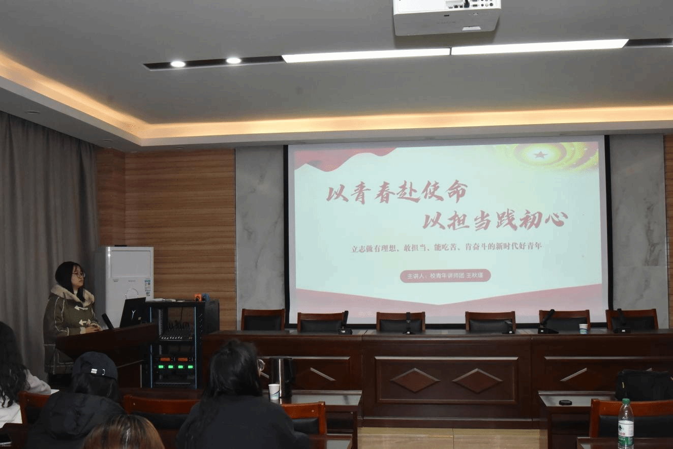 于博识楼3605会议室举办“以青春赴使命,以担当践初心”和“传承抗战精神,争做强国青年”主题宣讲会。学院各年级学生代表参加了此次会议。本次宣讲会由校青年讲师团成员王秋瑾与校大学生理论宣讲团成员郝甜甜主讲。