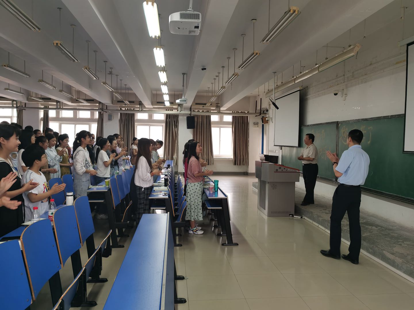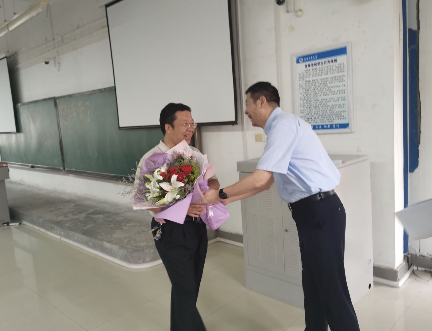 倾尽丹心育桃李,奉献韶华铸师魂。 9月10日上午和下午,院党委书记李刚等学院领导班子成员先后来到教室,向辛勤工作在第一线老师们送去鲜花和节日的美好祝愿,感谢老师们的辛勤劳动和无私奉献,并勉励老师们积极践行习近平总书记提出的“四有”好老师标准,在教书育人的工作中不断创造新业绩。