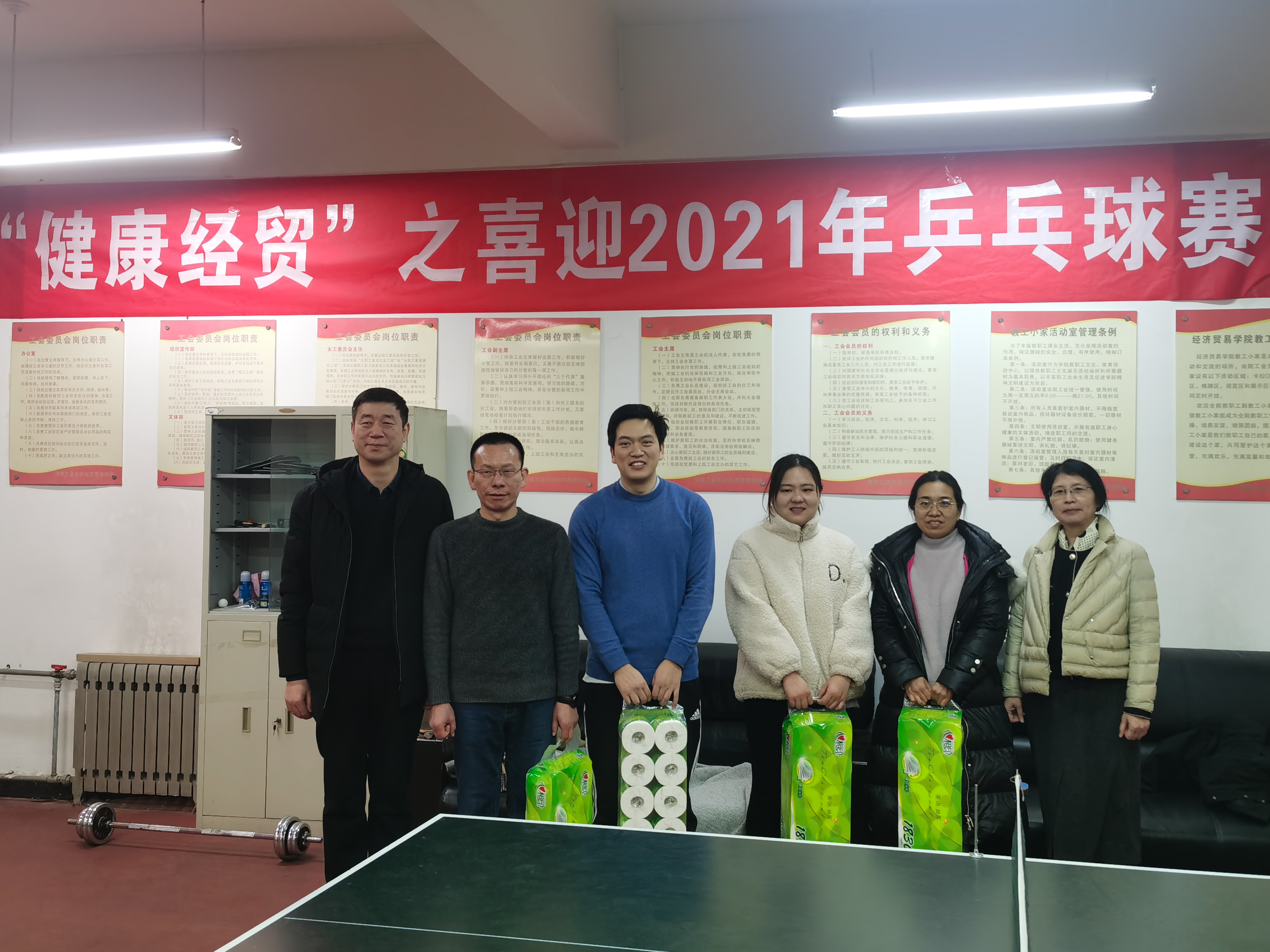 上午,学院在3509教工之家举行了“健康经贸”迎新年乒乓球赛。根据前期报名情况,通过抽签共分了四个组,每位参赛老师都带着愉悦的心情,展示高超的乒乓球技术,男单比赛紧张刺激,女单比赛也是巾帼不让须眉,男女双打更是精彩连连。最终程晓林老师领衔 的第二组获得了冠军。