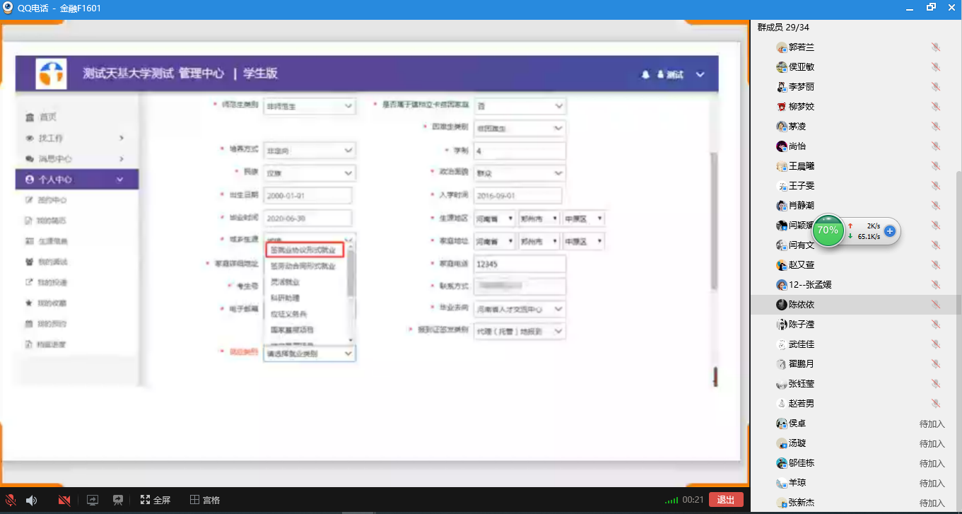 孙玉涵以前期调研收集的就业问题、困难和疑惑为问题导向,结合自身工作经验和身边案例,从当前就业形势、就业协议签订、人事档案寄发、单位派遣报到等方面作了详细介绍,并对涉及的重点环节、注意事项作了强调说明。重点讲解了近期推出的网上签约平台的使用方法,使用分享屏幕的方式演示线上签约系统操作过程,以便同学们可以顺利完成就业信息申报。