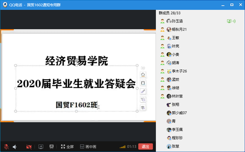 在班级答疑会上,孙玉涵首先就近期疫情期间学生关心的问题进行了集中解答,安抚学生焦虑、不适等情绪,鼓励大家适应线上求职。将学生内心疑虑的就业协议违约、报到证改派等问题,结合毕业生在此过程中可能出现的问题,对应课件内容组织提问。同学们在聆听的过程中针对具体的环节内容,结合自身实际情况逐一进行线上提问。交谈过程中,孙玉涵针对同学们提出的具有共性和个性的问题耐讲解并一一作答,针对具体问题给予同学们专业的指导建议。