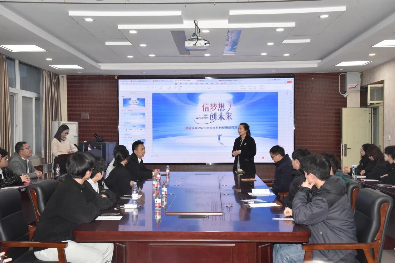 在博识楼3105会议室举办中信证券校园招聘会。院党委副书记岳鹏珍、金融系主任宋博、毕业班辅导员王秋瑾、中信证券郑州秦岭路营业部总经理陈斐、副总经理王国琴等工作人员出席本次会议。会议由中信证券企业代表许丹主持。