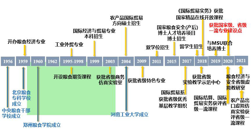 历史沿革:本专业肇始于1959年创建的北京粮食专科学校粮食经济专业,1999年开始本科招生。2009年获批河南省高等学校特色专业。2015年开始招收培养特需项目博士研究生。2017年在全省专业评估中名列第一,并获批河南省高等学校优秀基层教学组织。2018年获批国家精品在线开放课程《国际贸易实务》。2020年与MSU联合培养博士研究生。2021年获批国家级一流本科专业建设点、河南省黄大年式教学团队、河南省虚拟教研室建设点。