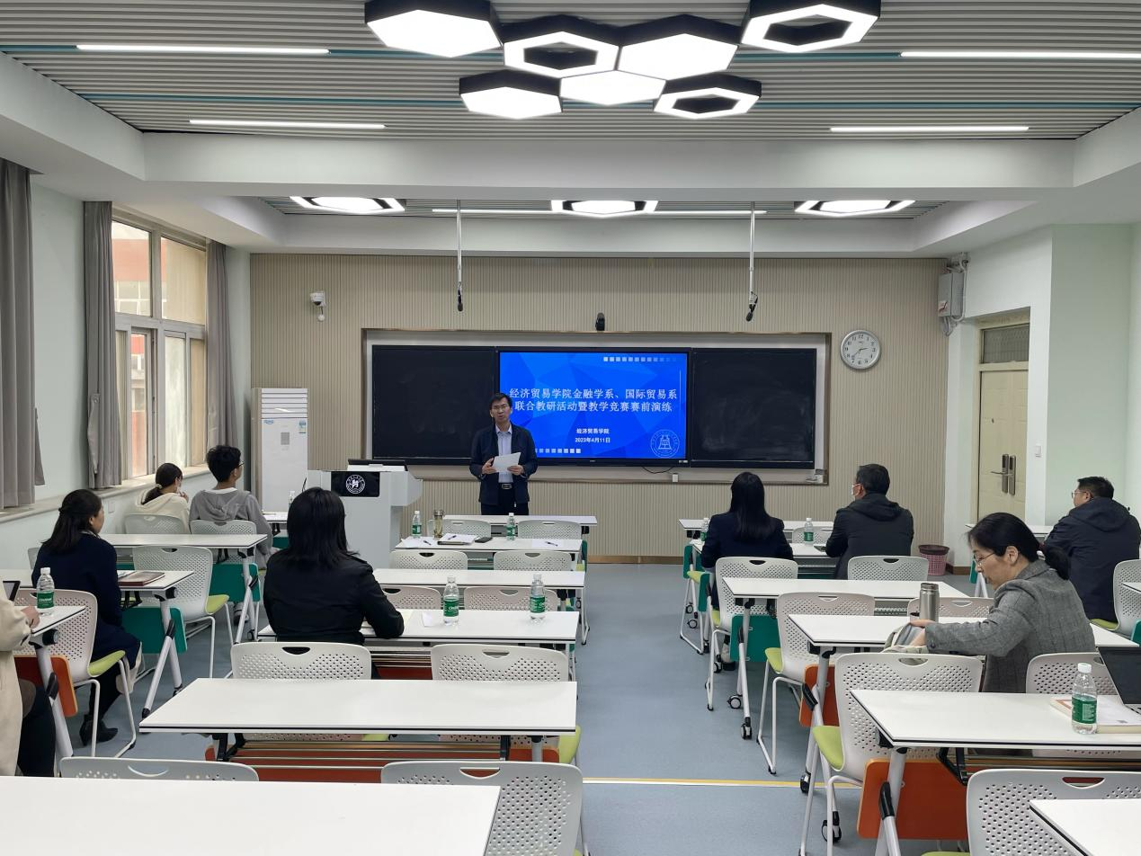组织金融学系、国际贸易系在3210智慧教室开展联合教研活动暨教学竞赛赛前演练,由学校教学督导王凯、戴晓鹂、学院教学督导吴成浩三位老师组成评审小组,学院部分青年教师观摩了比赛。活动由副院长朱坤林主持。