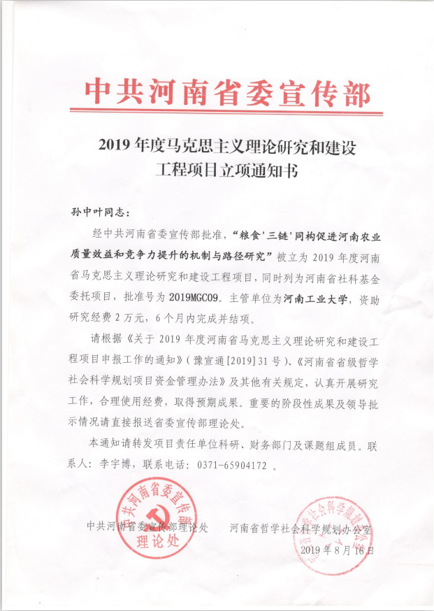 省级人文社科项目——粮食“三链”同构促进河南农业质量效益和竞争力提升的机制与路径研究