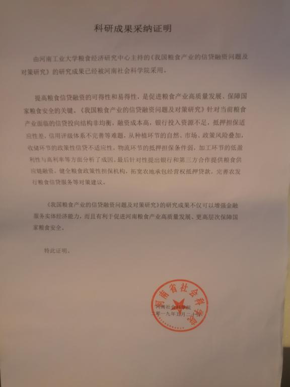 科技成果采纳证明——我国粮食产业的信贷融资问题及对策研究
