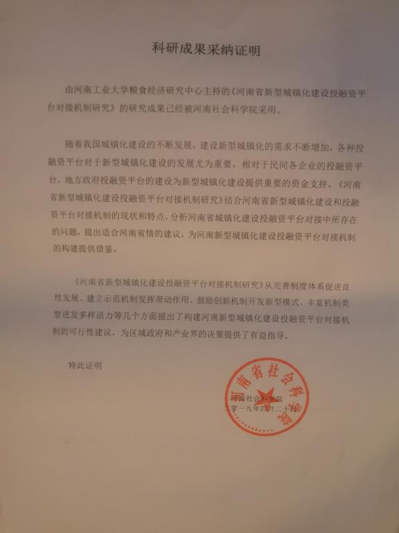 科技成果采纳证明——河南省新型城镇化建设投融资平台对接机制研究