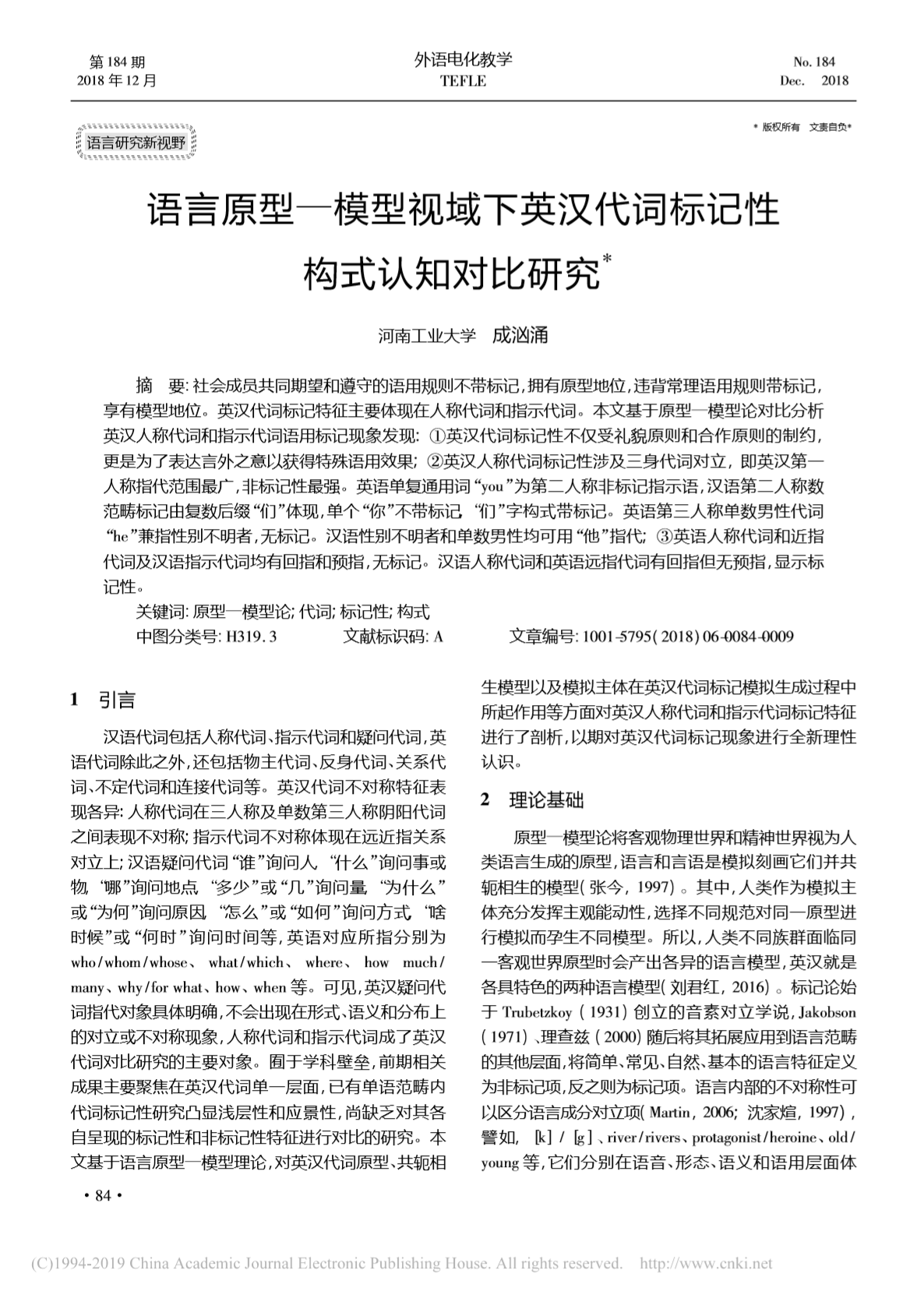 高水平论文11——语言原型—模型视域下英汉代词标记性构式认知对比研究