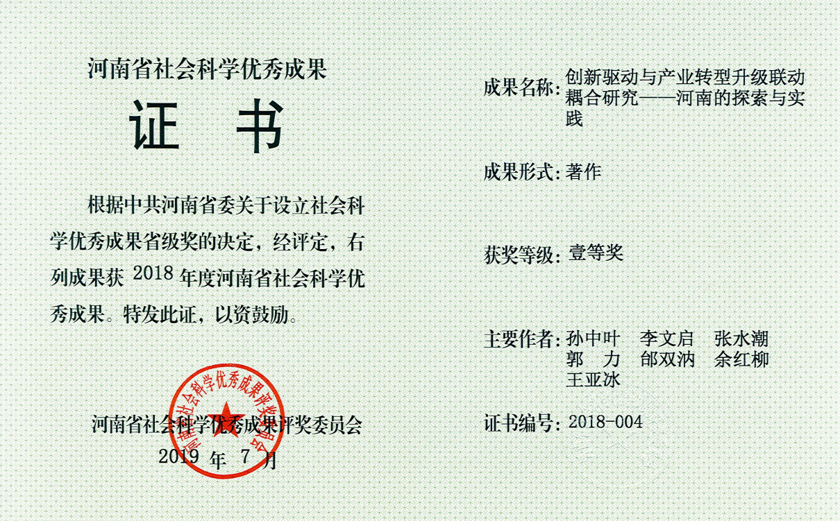 省部级奖1——创新驱动与产业转型升级联动耦合研究—河南的探索与实践